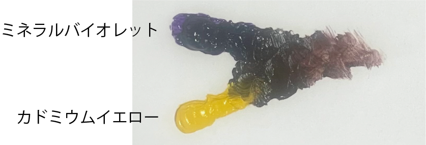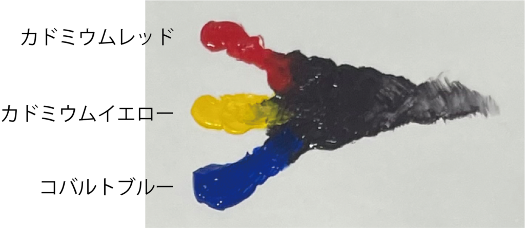 カドミウムレッド+カドミウムイエロー+コバルトブルーなど、赤・黄・青の三原色を混ぜ合わせる方法です。