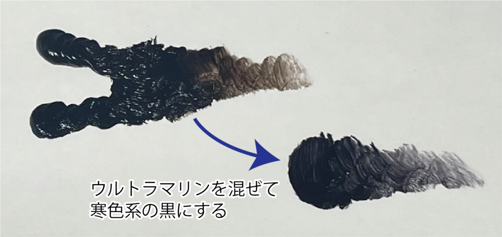 混色で黒を作る場合、混ぜる色の比率で「暖色・寒色」や「明度」をコントロールできるのが魅力です。
