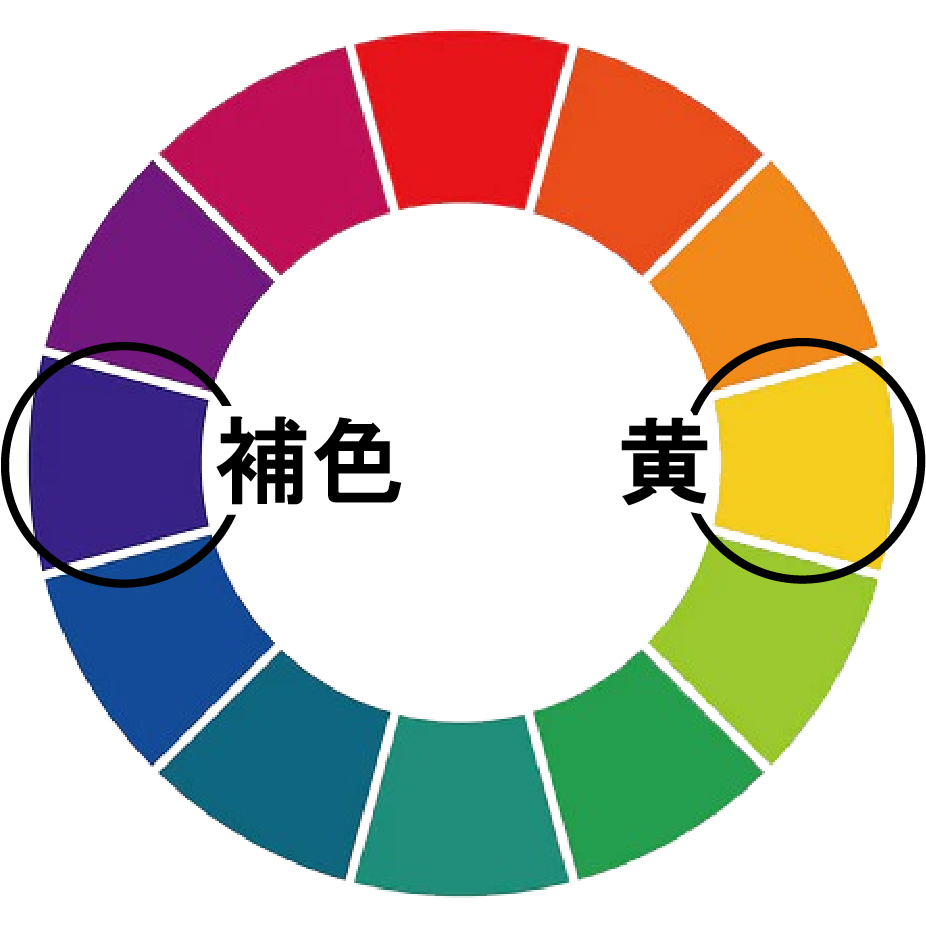 例として、下図の色相環で「黄色」の反対位置の「青紫」が補色となる