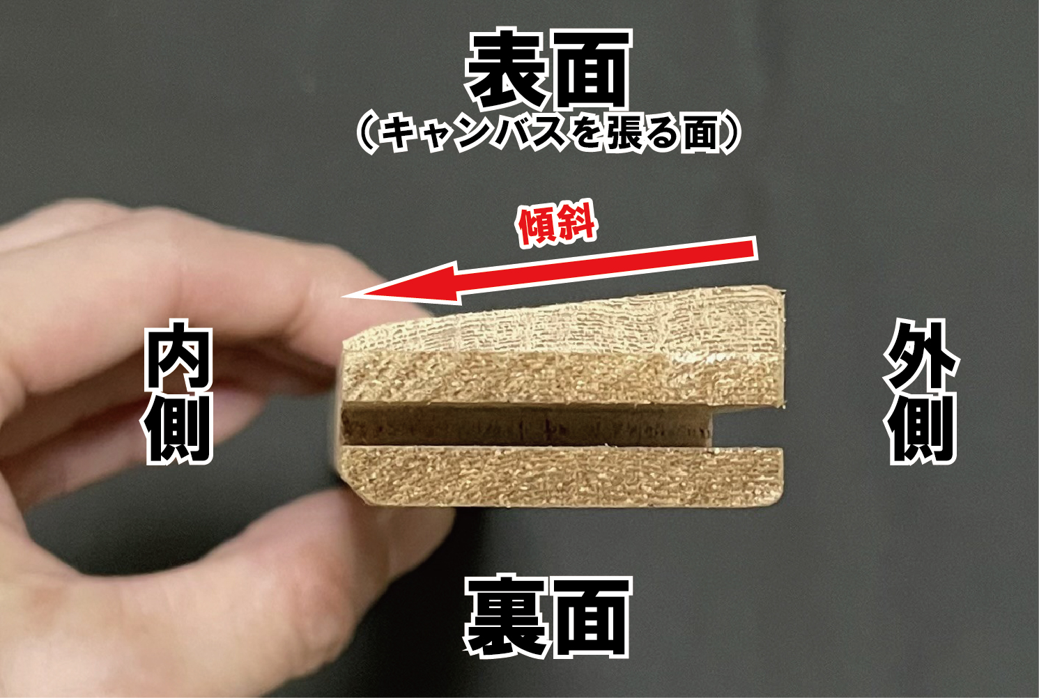 木枠の断面を見て、下図のように傾斜が付いている方が表面になり、
