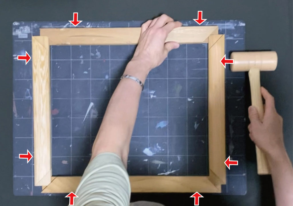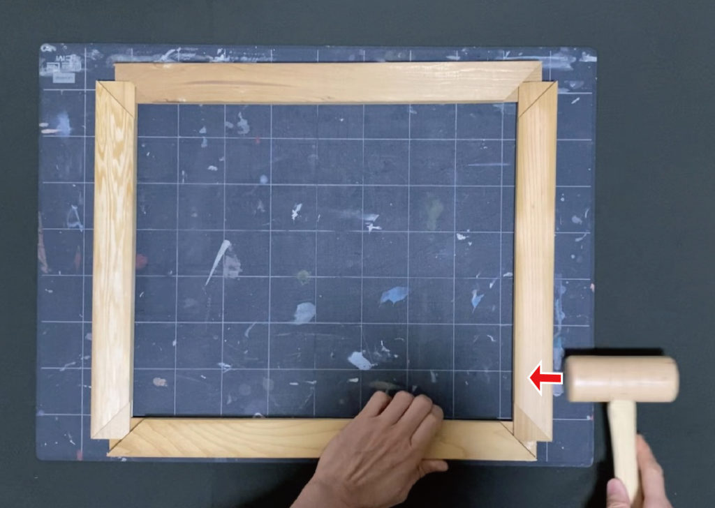 木枠を叩いて、4つの角が直角になるように調整する。