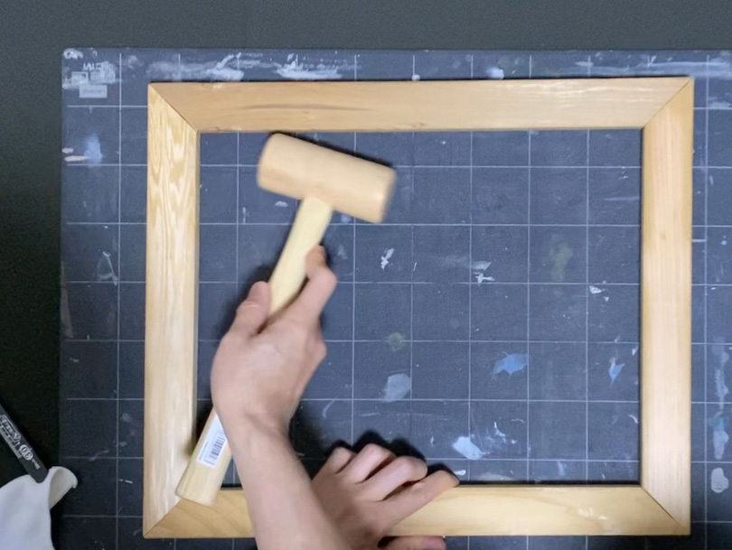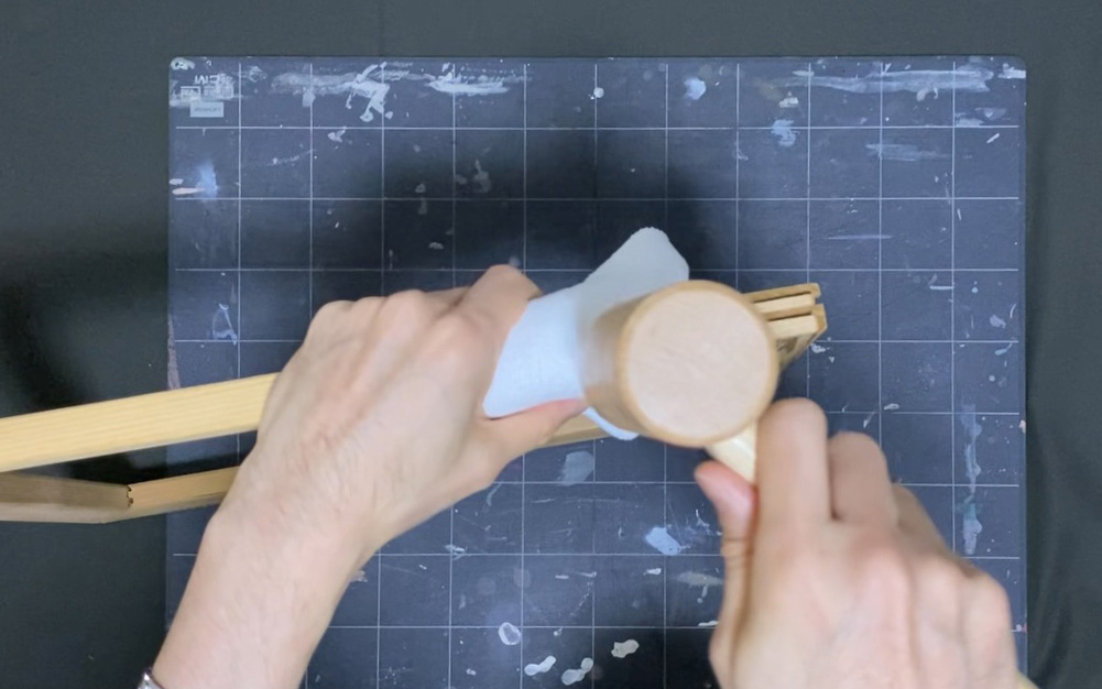 木枠にタオルや木片を当ててから、金槌で叩きます。