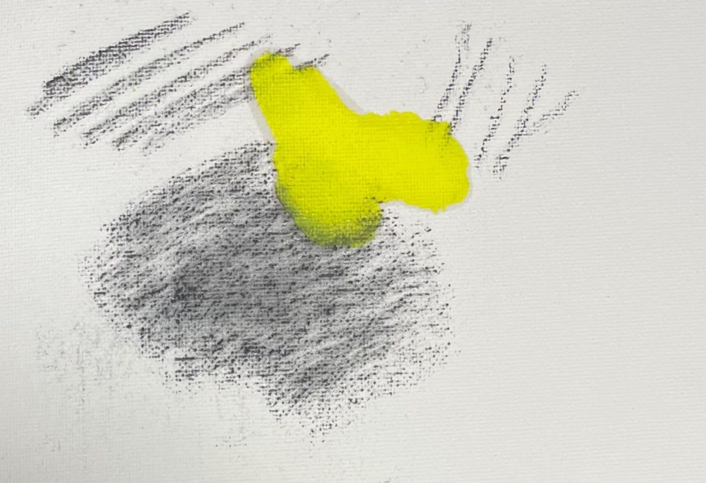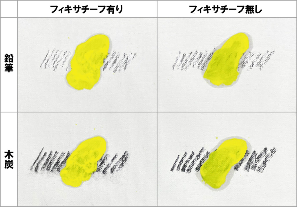 以下は、鉛筆と木炭にフィキサチーフをかけた・かけない状態にして、その上にレモンイエローを塗って比較した画像です。フィキサチーフ無しの方が、鉛筆、木炭とも粉が溶けて色が濁っています。